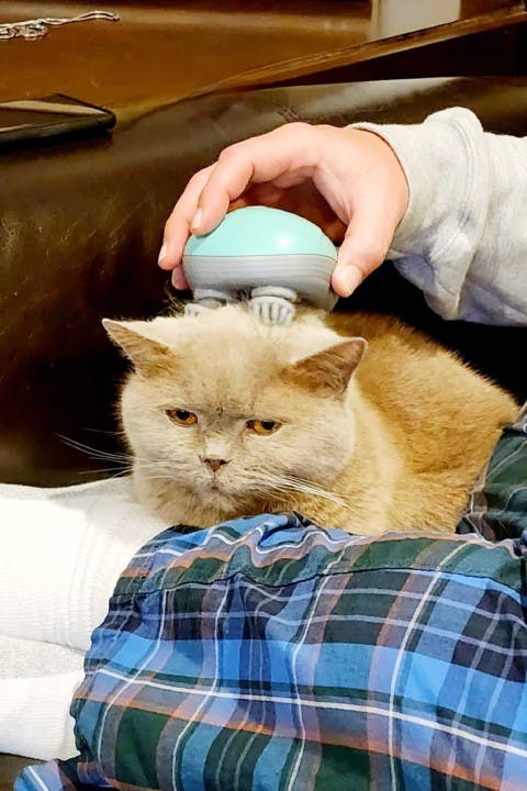 O massageador favorito dos Pets, para cães e gatos, possui 4 cabeças de massagem em silicone macio que cobrem 24 nós de massagem.